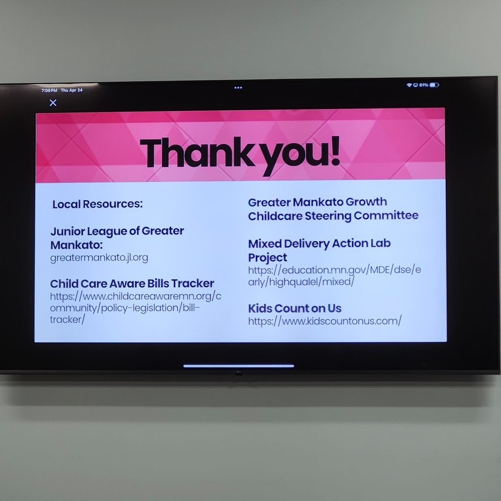 On Thursday, April 24, 2025, I attended a Junior League of Greater Mankato event focused on the state of childcare in our region. As a school board member with older children and a member of the community education committee, I prioritize engaging with parents of younger children to better understand their needs and represent our community effectively. This event provided valuable insights into the challenges facing childcare providers and families.