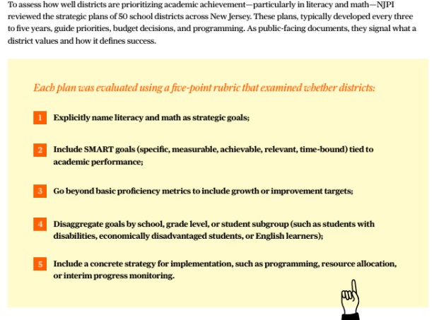 To see whether districts were using strategic plans as tools to change adult behavior and improve student outcomes, the New Jersey Policy Institute scored each plan on five things:
