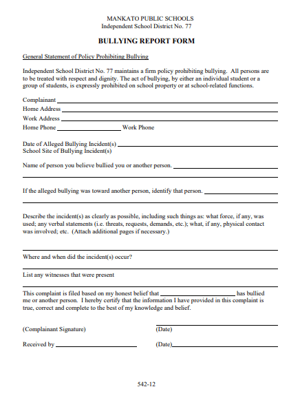 Bullying Report Form (Section 542-12 Last page of the form) at Mankato Area Public Schools. (every school in Minnesota will have a similar form in accordance with State Statue 121A.031