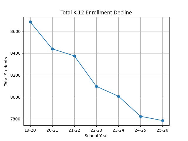 Across the reports, total K12 district enrollment has declined meaningfully since 2019–2020.